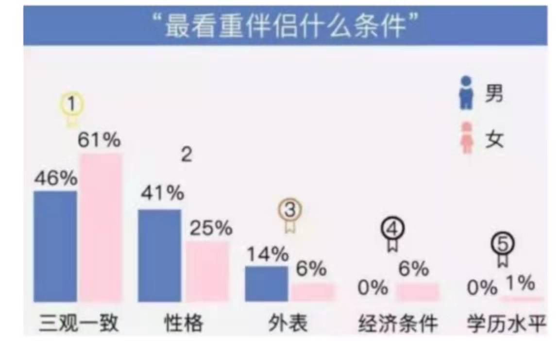 由此可见,不论处于哪个年代,“三观一致“都是我们择偶的重要参考标准,当然不是找个三观完全一样的人,而是两个人能够彼此理解、相互包容,遇到问题能够很容易达成共识的伴侣。